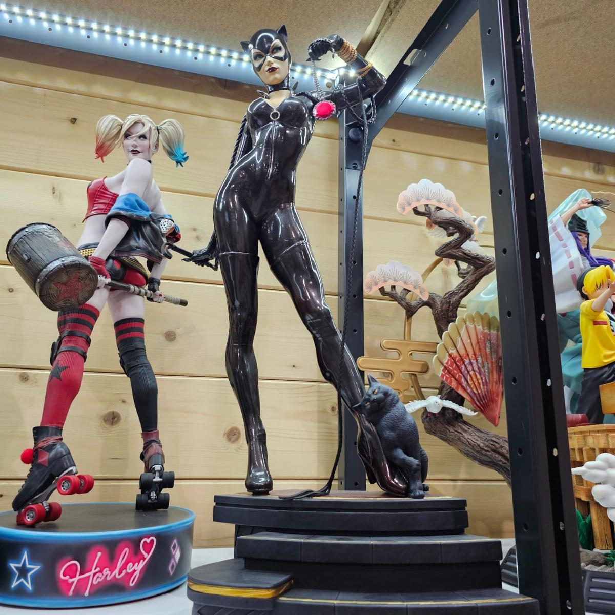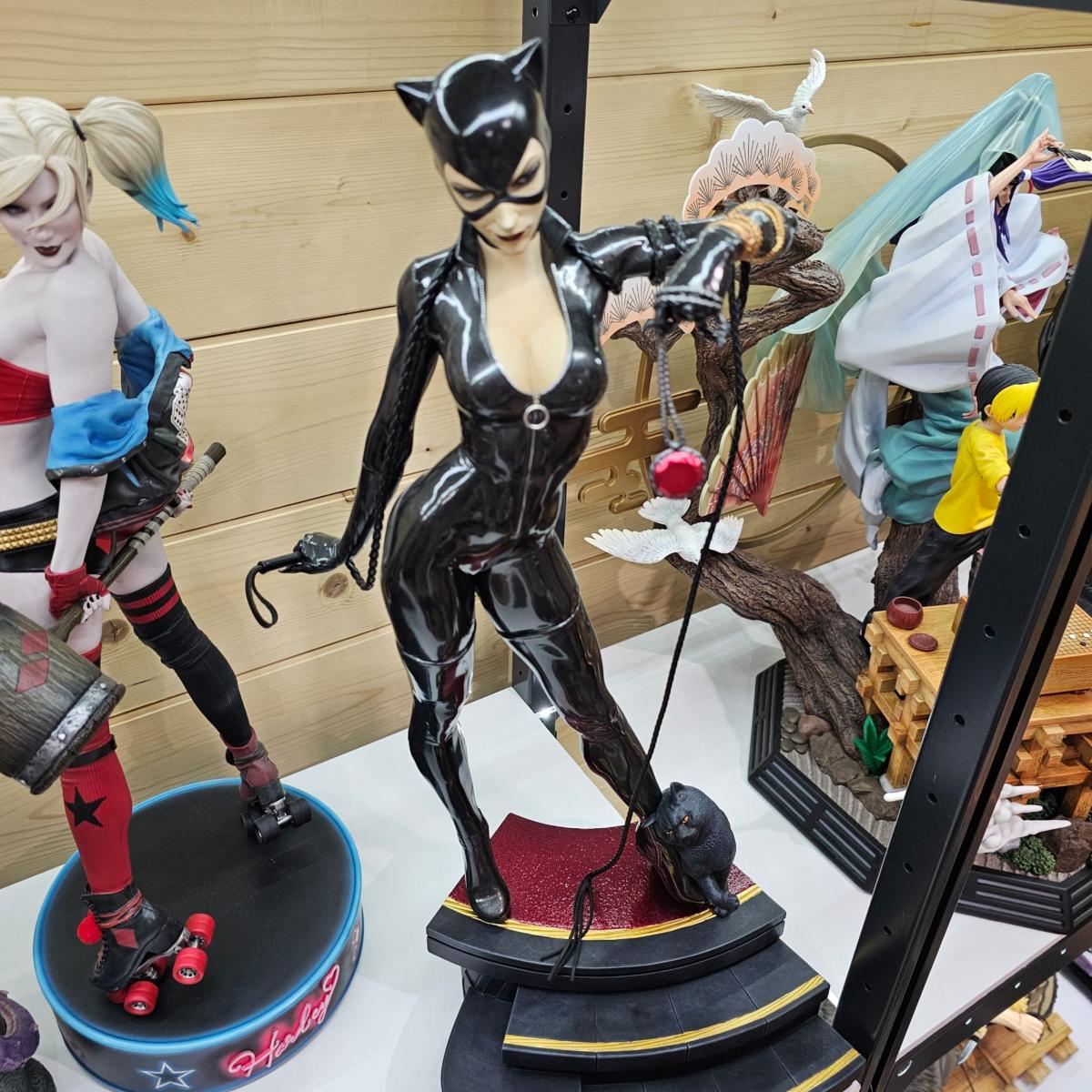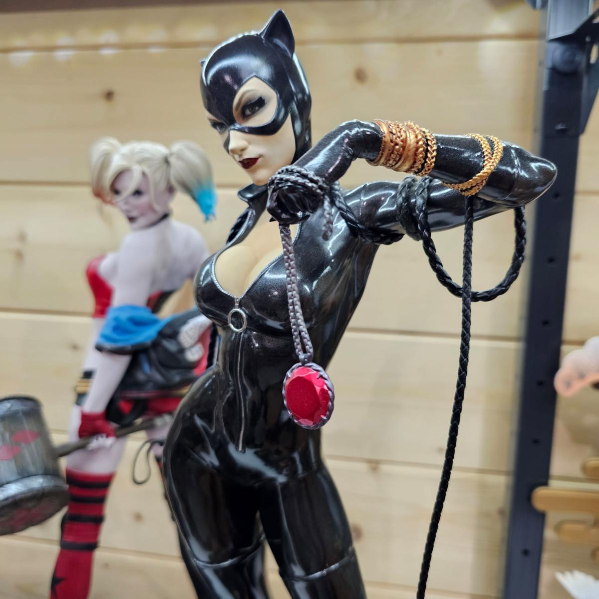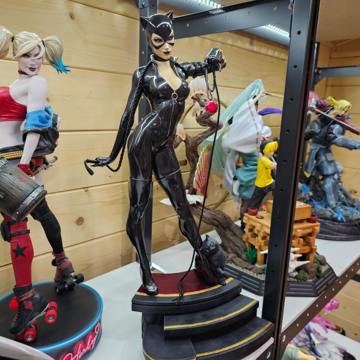 Une interprétation iconique de Selina Kyle / Catwoman, avec pose dynamique, costume satiné et décor soigné.