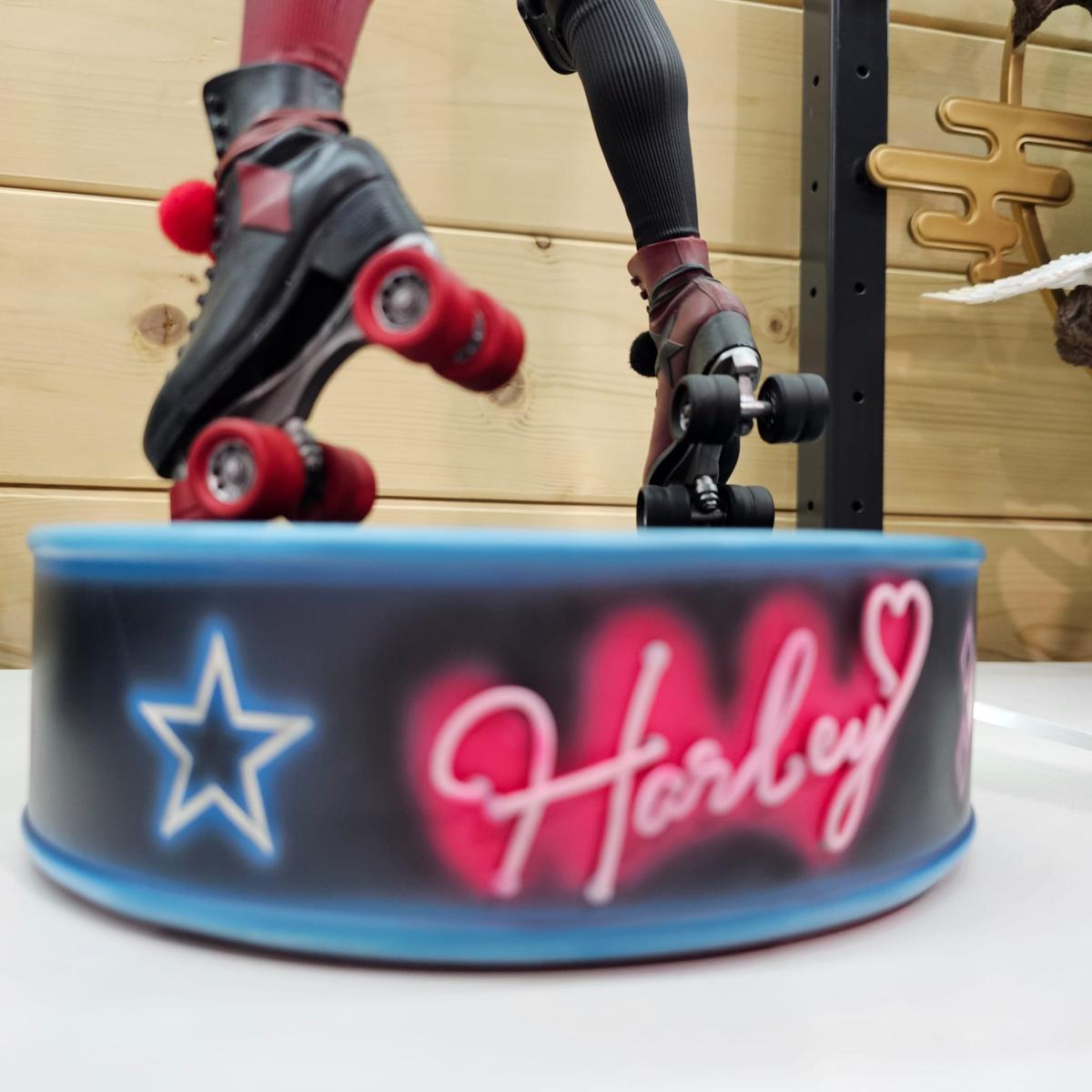 Harley Quinn patine avec malice au-dessus d’un socle thématique inspiré de Gotham. Armée de sa batte et de son célèbre maillet, elle arbore un sourire dément et une attitude désinvolte, prête à faire tourner la tête de tous ceux qui croiseront sa route.