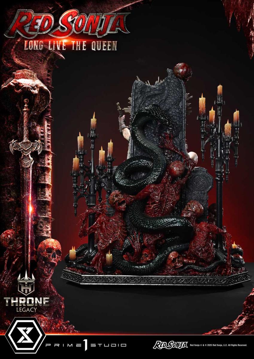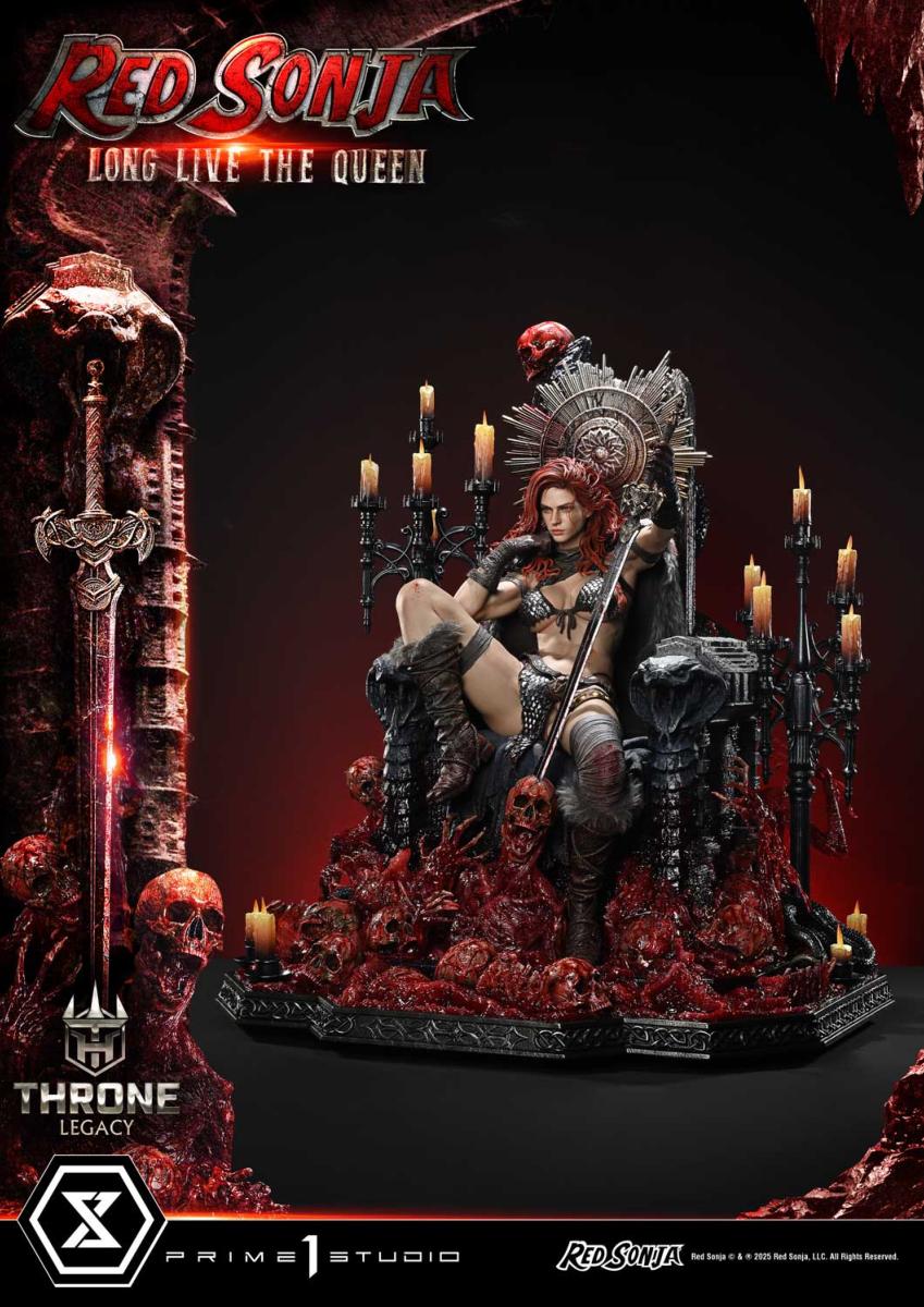 L’ensemble repose sur une base thématique Red Sonja reproduisant le trône et les créatures vaincues à ses pieds, symbolisant la puissance et la détermination de la légendaire guerrière.