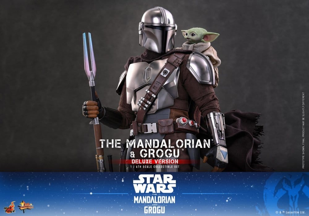 Le set The Mandalorian™ et Grogu™ (version deluxe) à l’échelle 1/6 par Hot Toys propose une figurine ultra détaillée de Din Djarin (31 cm), avec tête réaliste inspirée de Pedro Pascal et casque électroplaqué. Son armure Beskar chromée et sa tenue complète sont fidèlement reproduites.